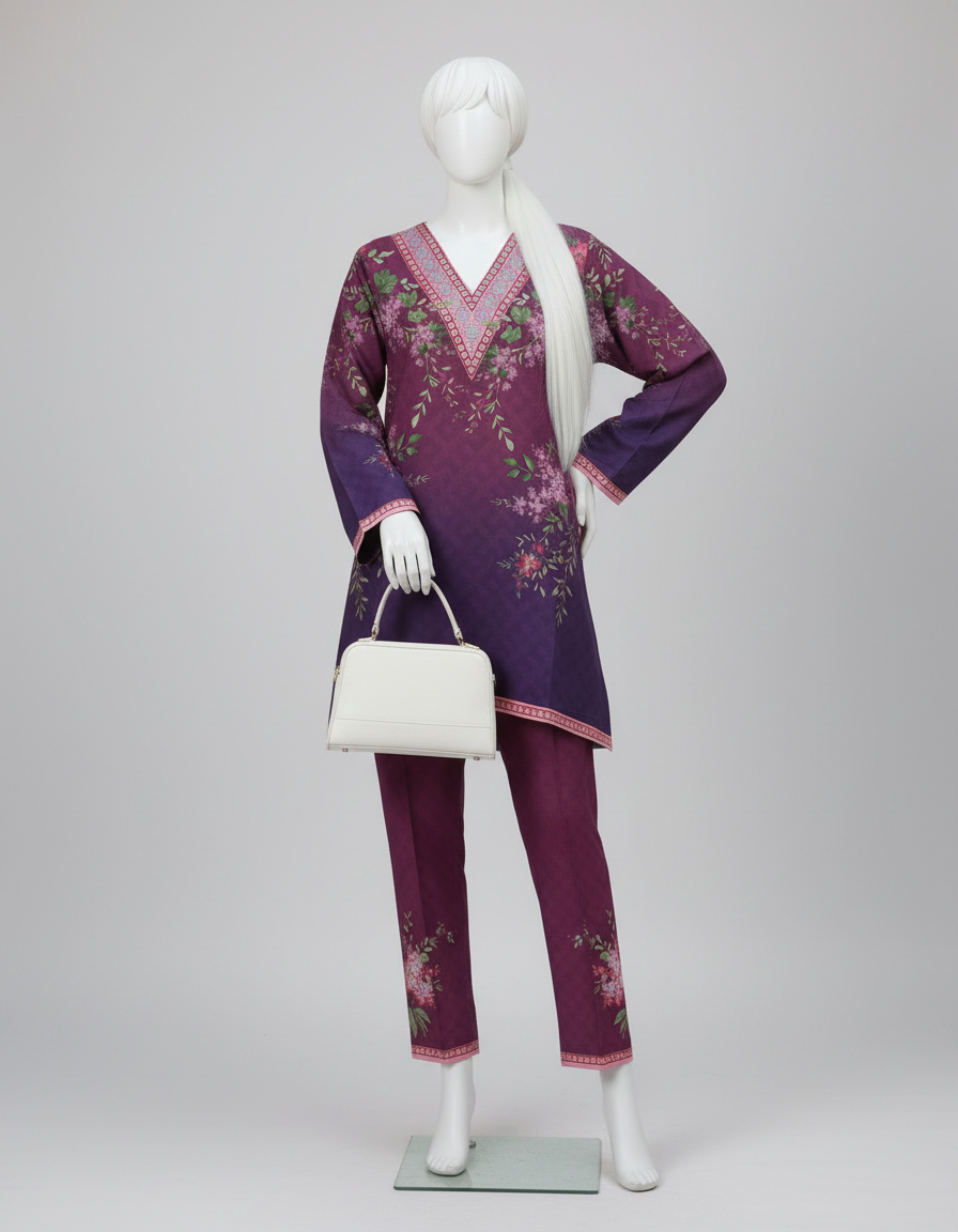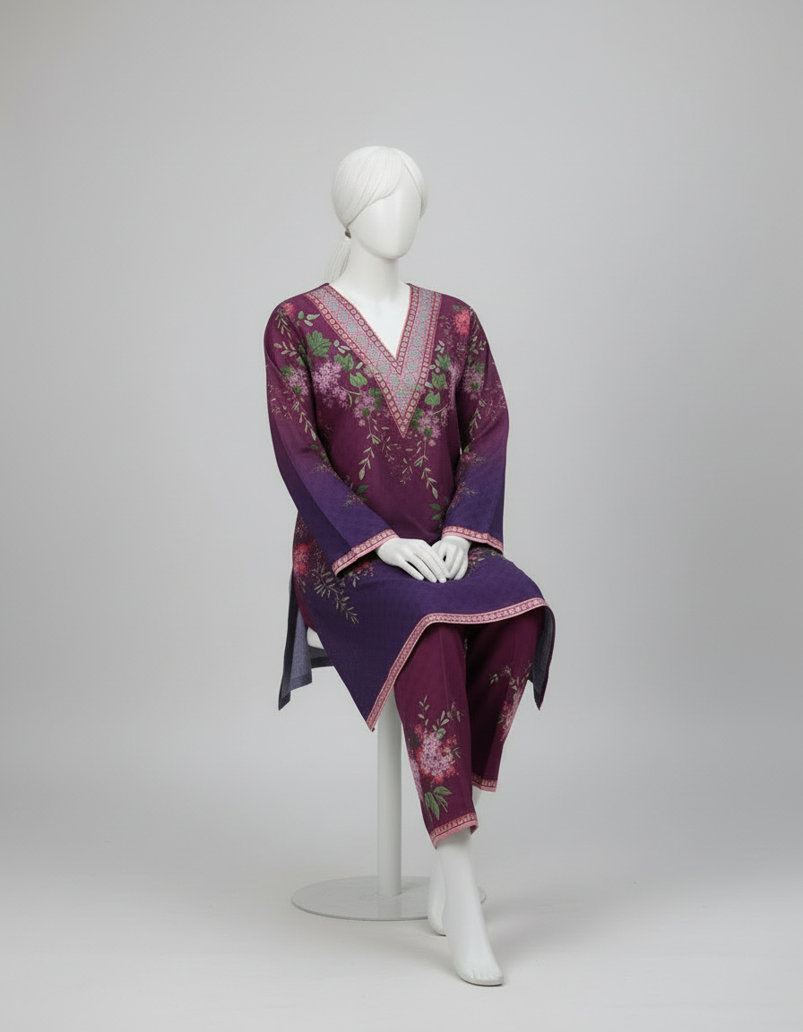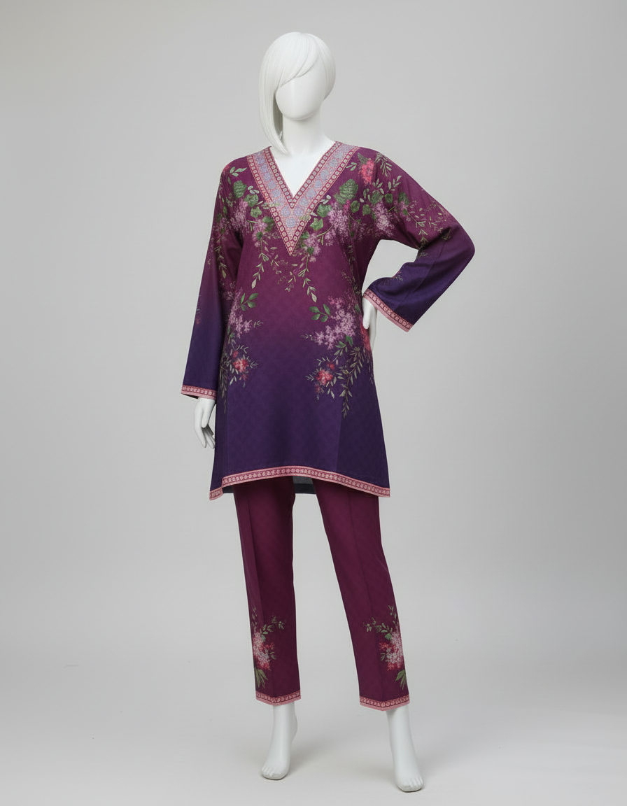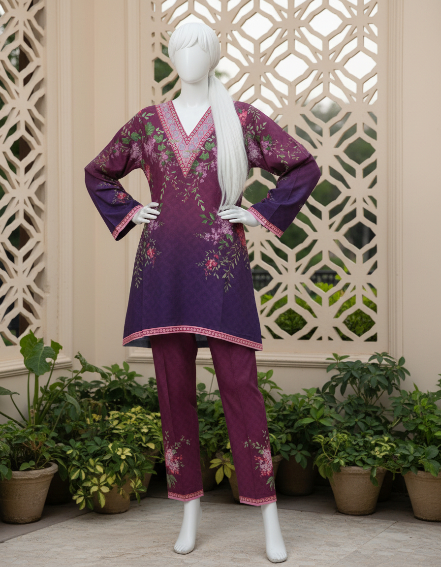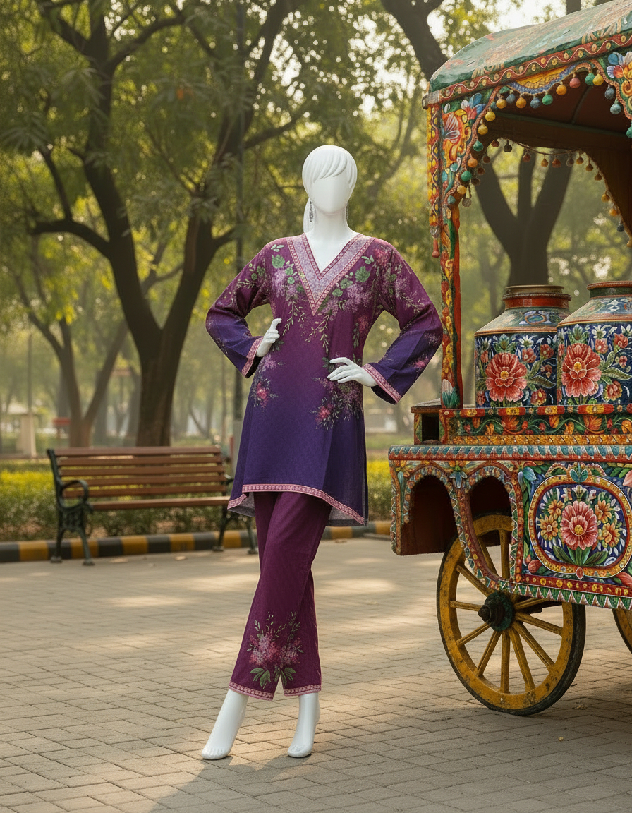 Elevate your style with the enchanting Arctic Majesty ensemble from WearMahenoor’s Dilkash Collection. Designed in rich shades of plum and deep purple, this outfit blends royal elegance with modern charm. Delicate floral artistry in soft pinks and greens cascades gracefully across the shirt and trousers, creating a refined, feminine look perfect for any season.