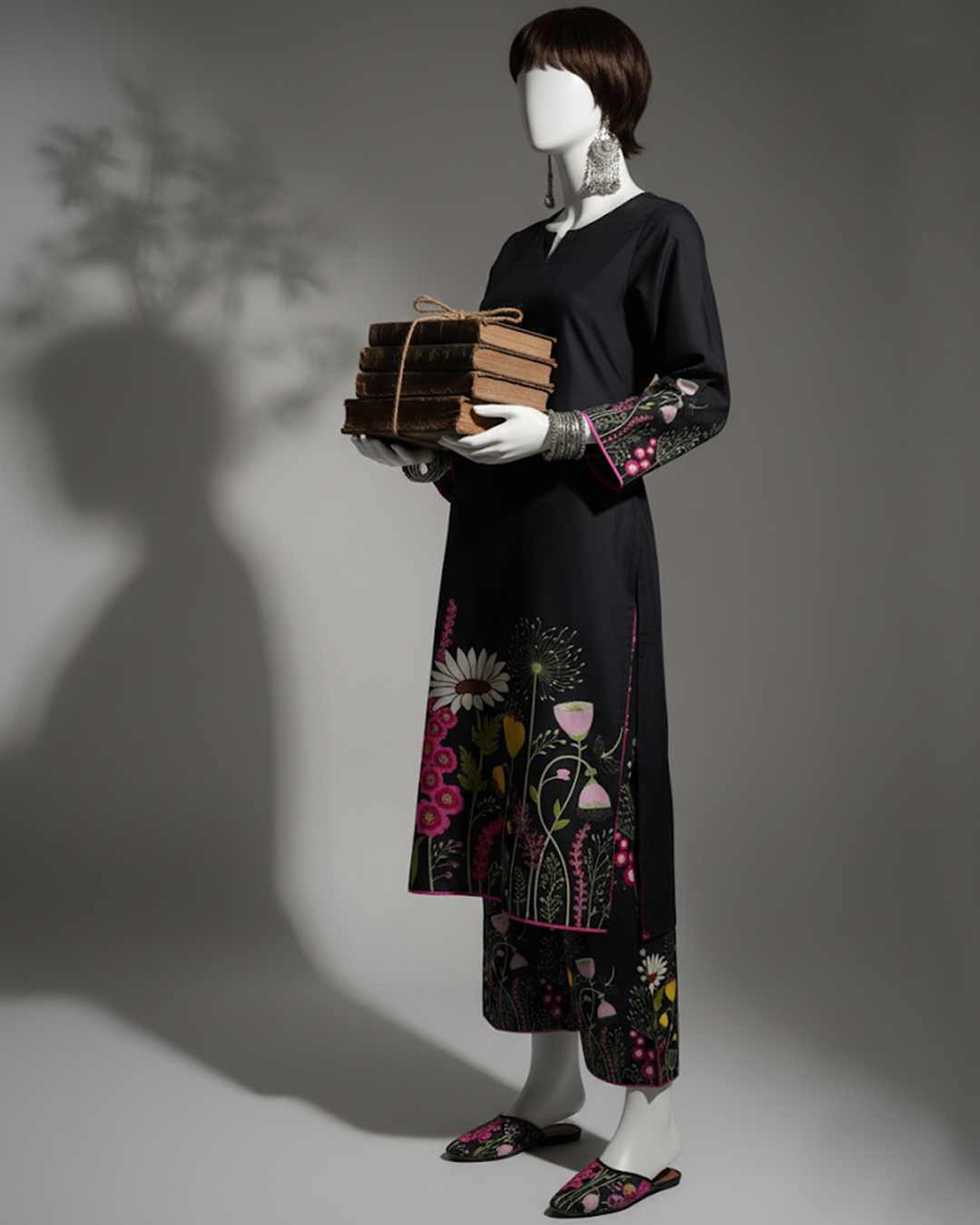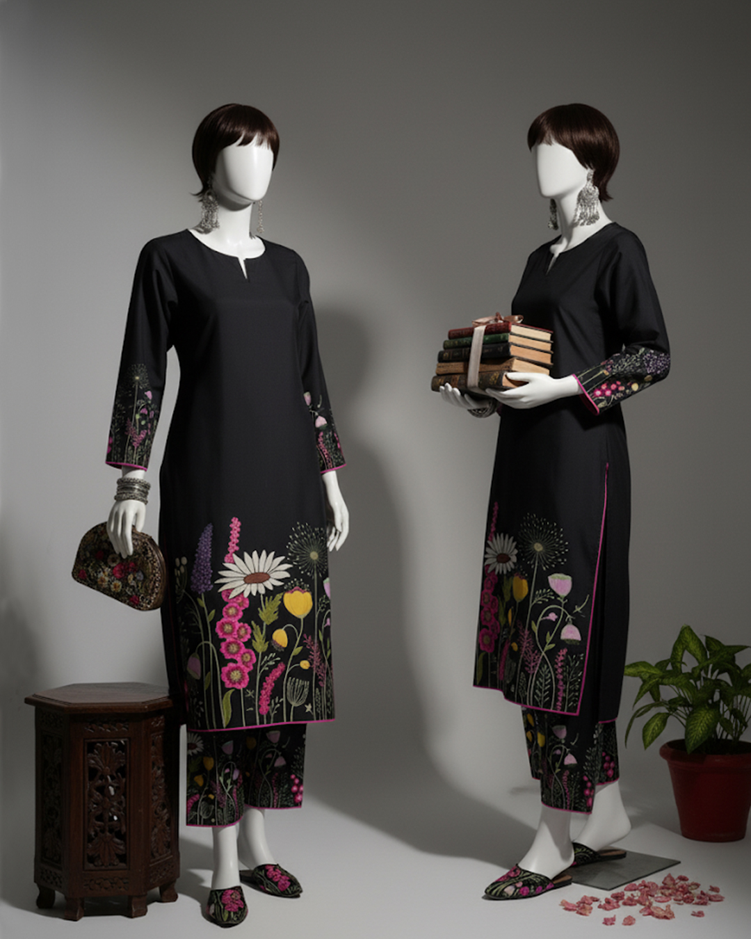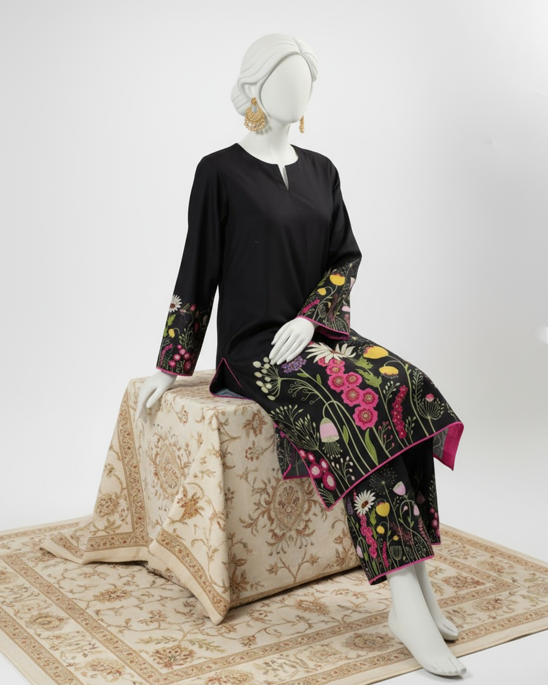 Black Aroura Swiss Lawn Co-ord Suit with Multicolor Floral Print – Amber Collection | Wearmahenoor