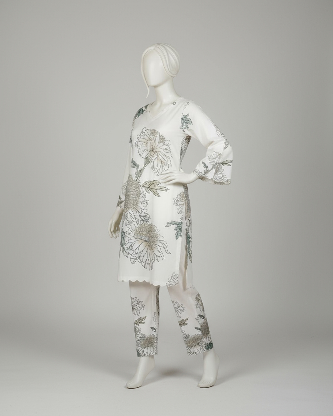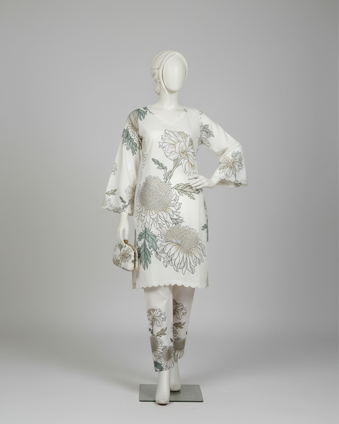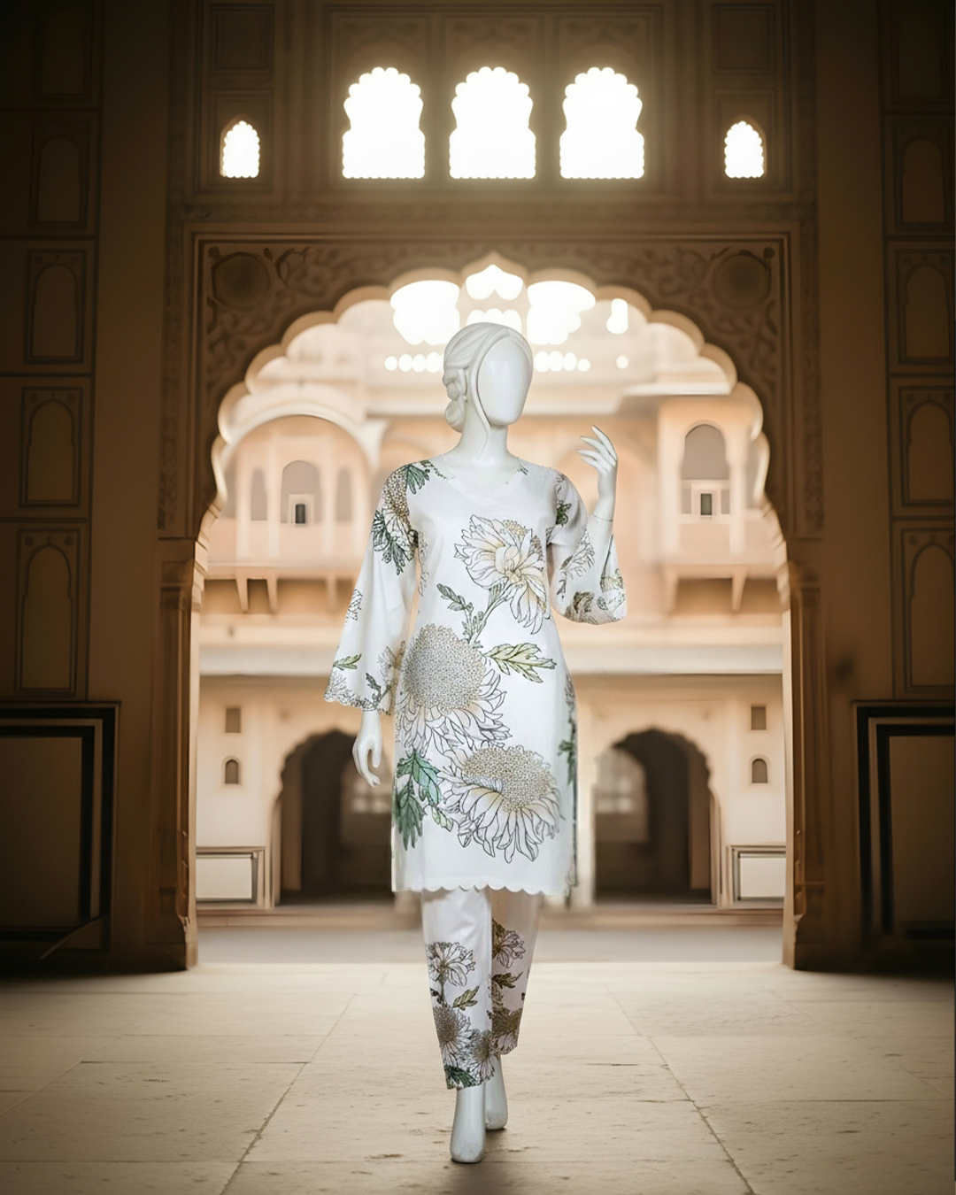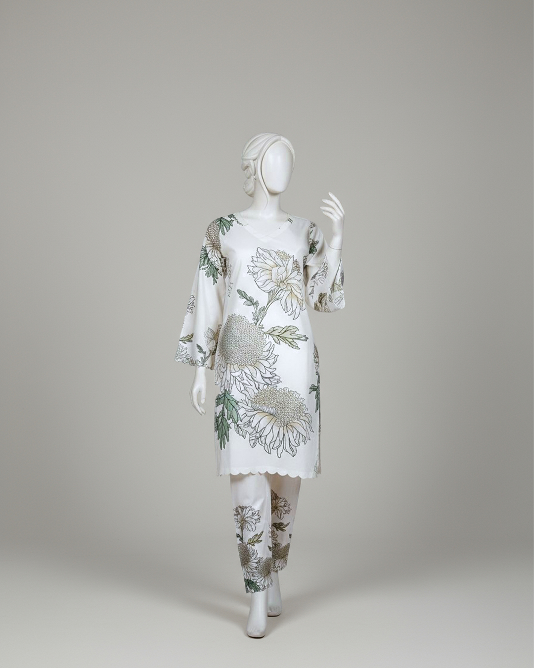 A refreshing take on timeless elegance — this soft cream stitched two-piece from our Marhaba Collection is all about refined beauty and breathable comfort. Tailored in premium Diamond Lawn, the ensemble features oversized floral prints in serene green and golden hues.