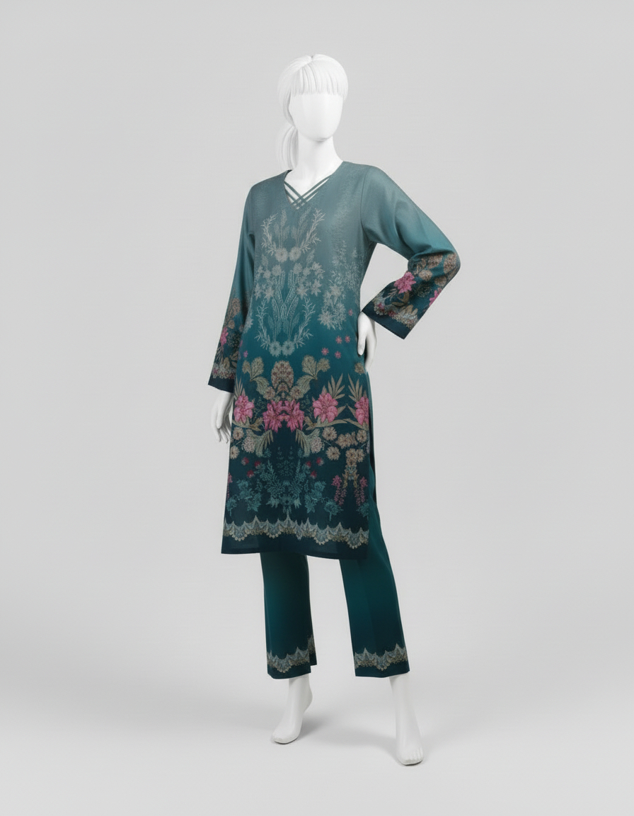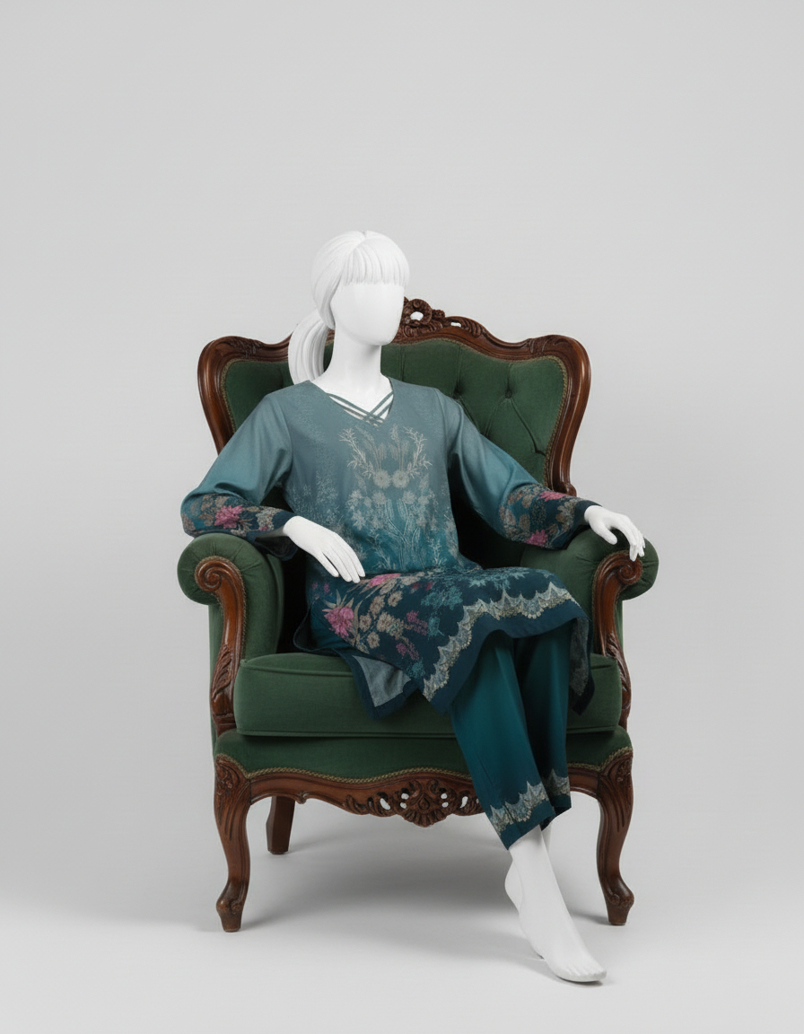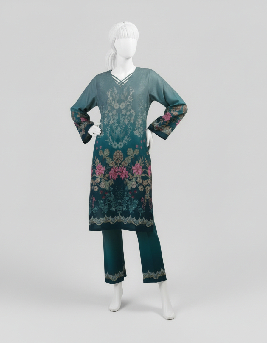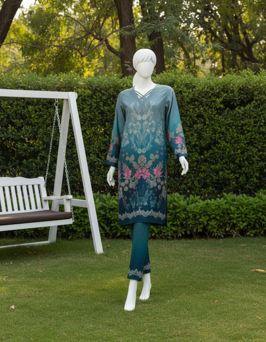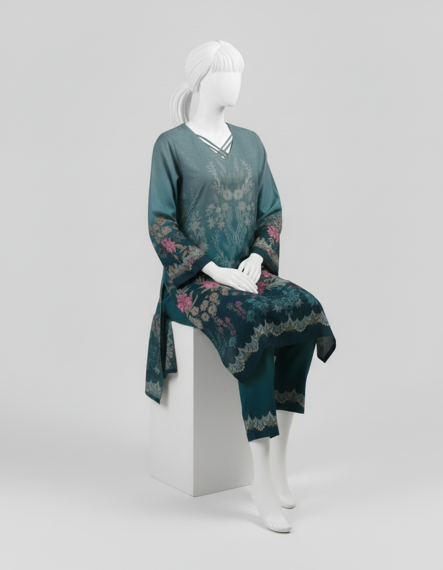 Bring a touch of artistic sophistication to your wardrobe with the Frosty Bloom suit from WearMahenoor’s Dilkash Collection. Crafted from premium lawn fabric, this ensemble showcases a deep teal canvas adorned with intricate floral artistry in soft pink, beige, and sage tones. The harmonious gradient effect and detailed botanical patterns create a graceful, poised look ideal for all-season wear.