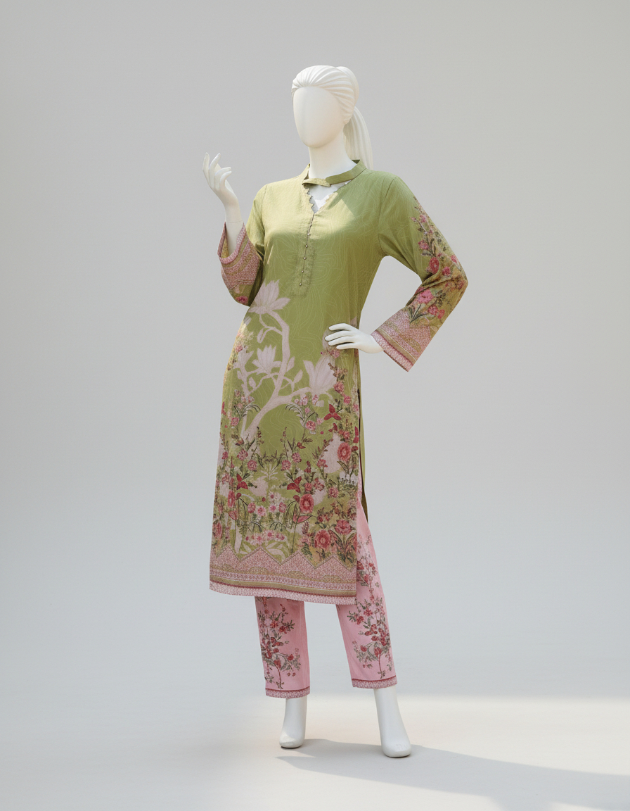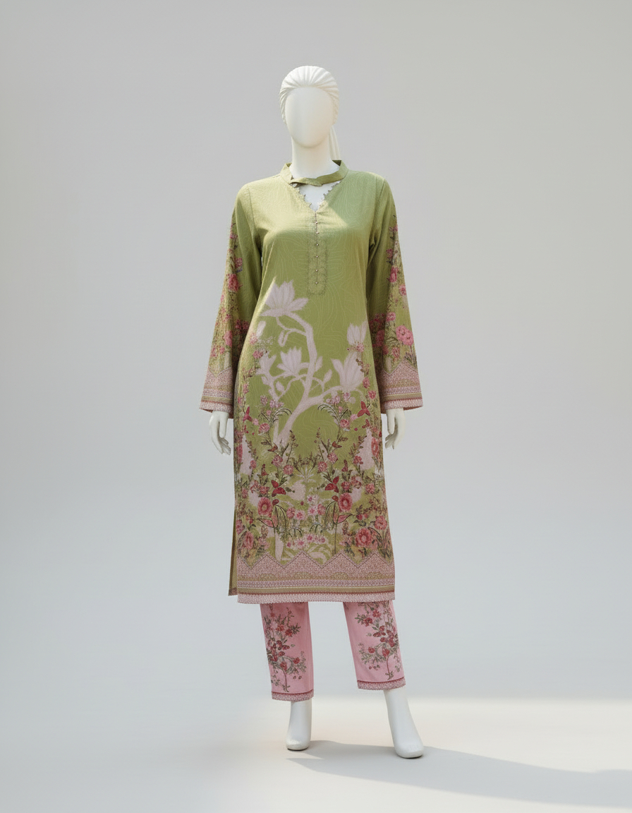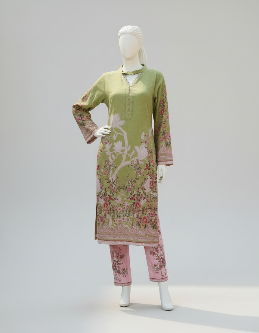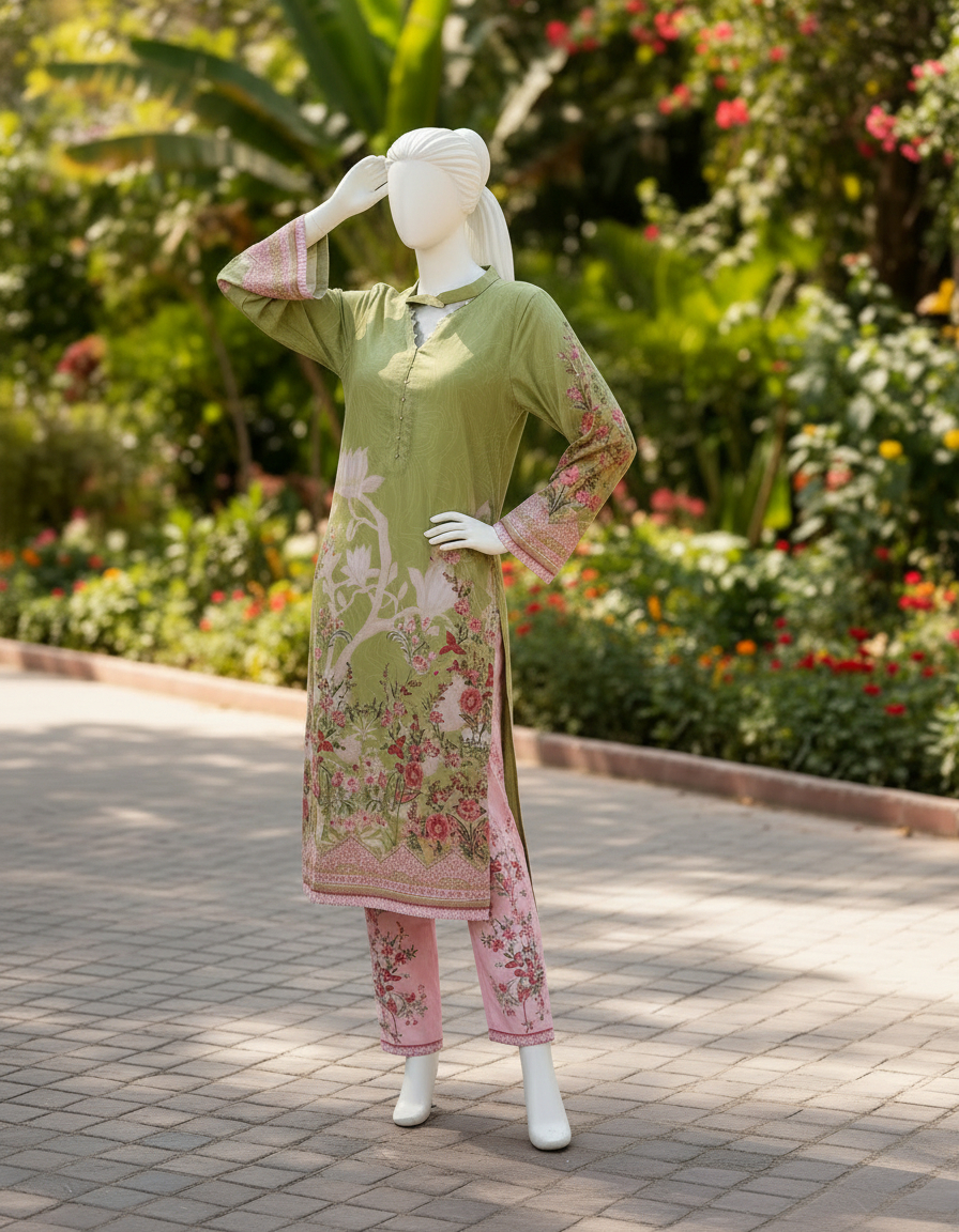 Step into timeless elegance with Mystic Royal, a serene and artfully designed ensemble from the Dilkash Collection by WearMahenoor. This captivating outfit features a soothing olive-green canvas enriched with soft pink and earthy floral artistry, creating a graceful, nature-inspired aesthetic perfect for all seasons.