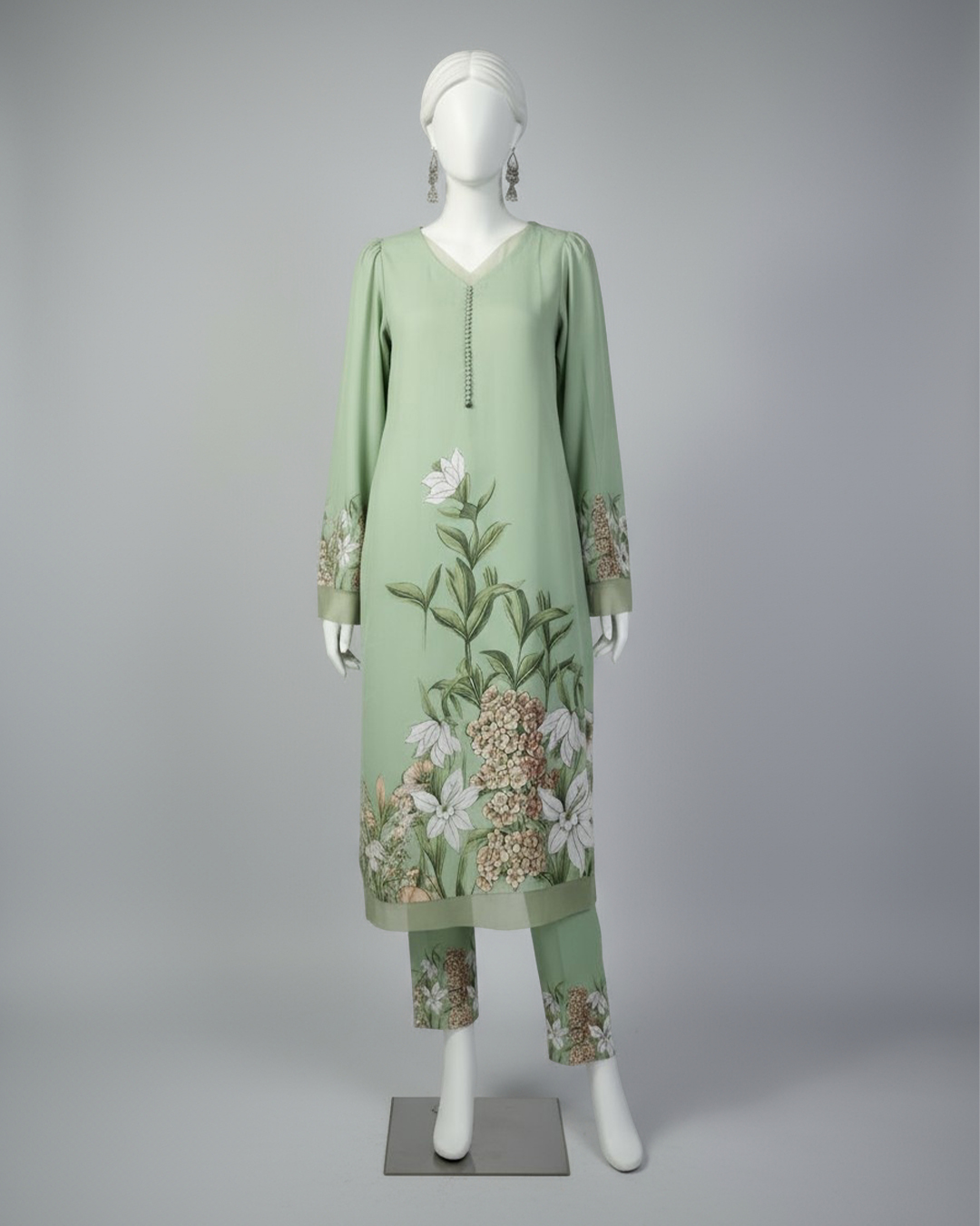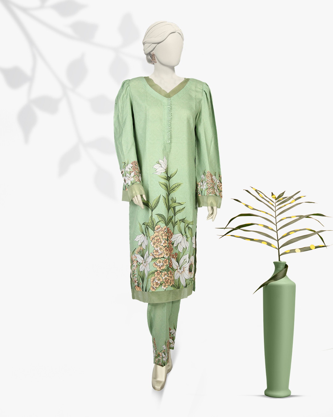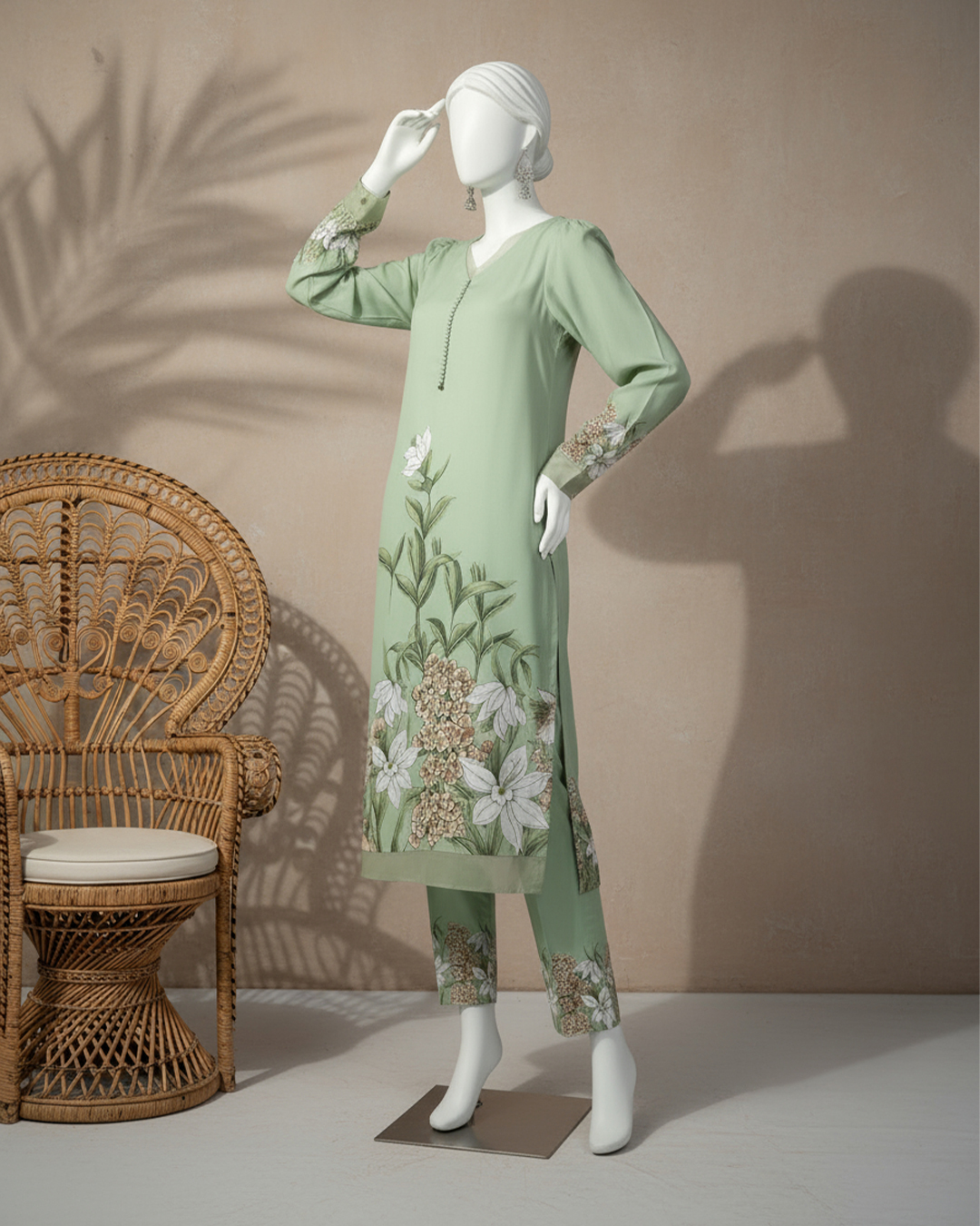 Infused with freshness and timeless charm, this serene cyan stitched two-piece from Mah-e-Noor’s Marhaba Collection beautifully merges nature and tradition. Crafted from soft, breathable Diamond Lawn, the design is adorned with graceful floral prints that exude calm elegance.