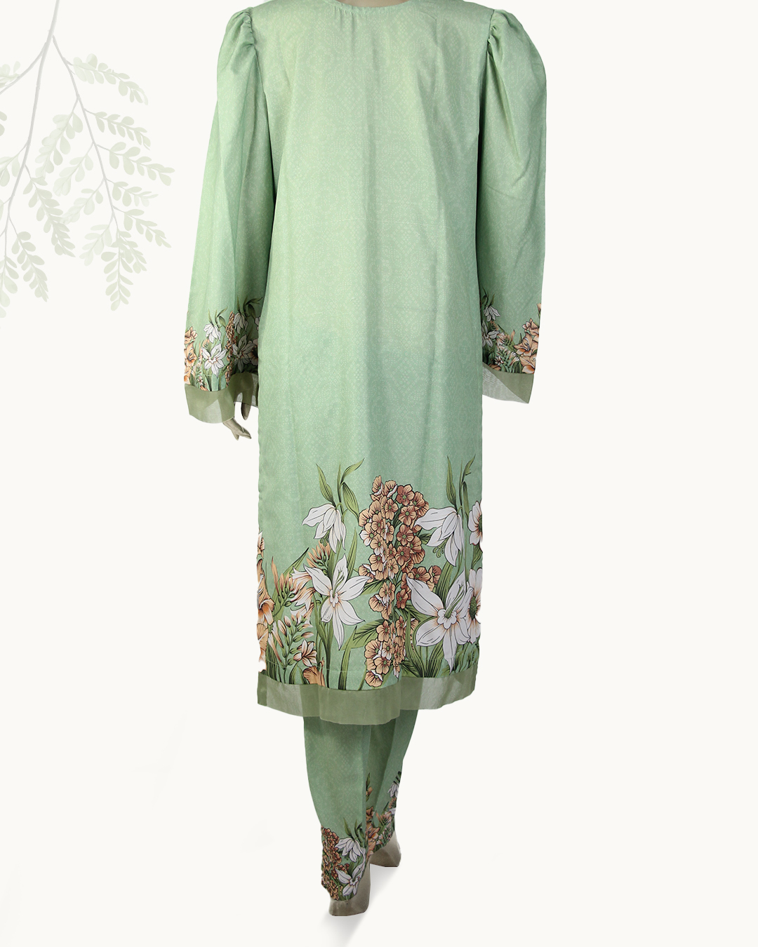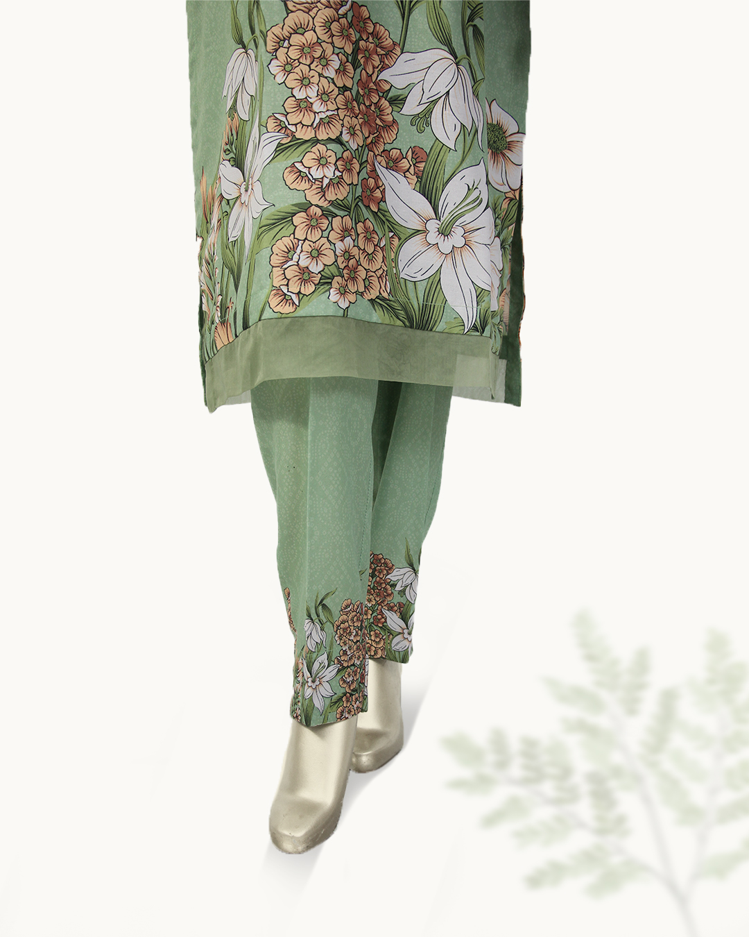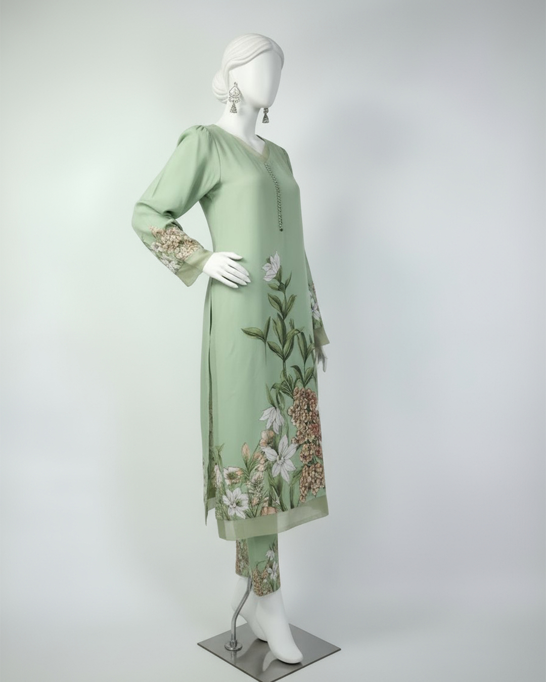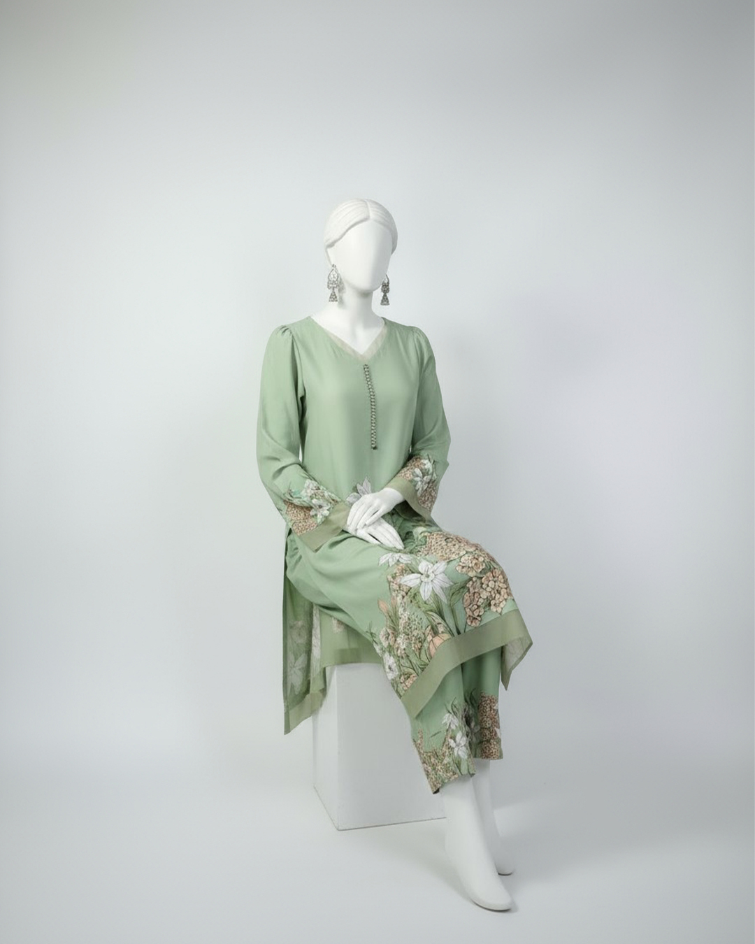 Infused with freshness and timeless charm, this serene cyan stitched two-piece from Mah-e-Noor’s Marhaba Collection beautifully merges nature and tradition. Crafted from soft, breathable Diamond Lawn, the design is adorned with graceful floral prints that exude calm elegance.